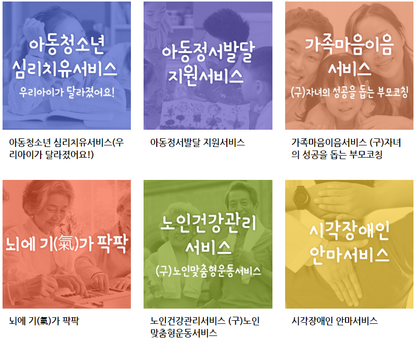 지역별로 다양한 차별적인 서비스지자체가 주도적으로 발굴함으로써 지역주민이 체감하고 만족하는 사회서비스 제공합니다. 서비스 시장 형성 가능성이 높은 분야를 발굴, 수요자의 구매력을 보전함으로써, 지속가능한 사회서비스 시장 형성 및 일자리 창출을 위한 사업입니다.