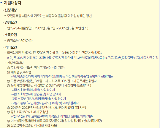주민등록상 서울에 거주하는 최종학력 졸업 후 미취업 또는 주 30시간이하 또는 3개월 이하 단기로 상태인 청년.