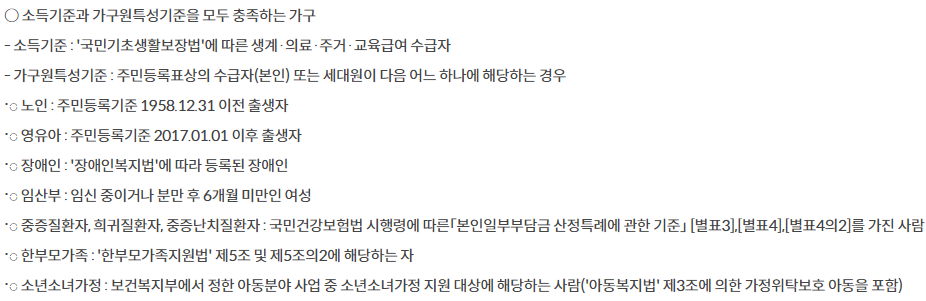 소득기준, 가구원 특성기준을 모두 충족하는가구여야합니다.