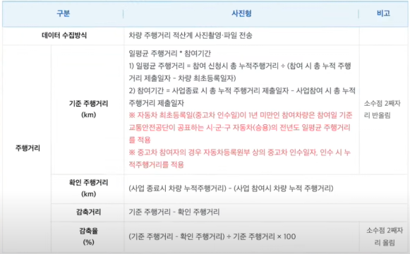 여기에서 정확히 알아야 할 내용은 감축 거리에 대한 기준입니다. 작년에 한 해에 비해 올해 운전한 거리가 아니고, 참여 신청을 한 날부터 최초로 자동차를 등록한 날짜까지의 기간을 빼고 현재의 계기판상 총 주행거리로 나눠서 차량을 구입하고 지금까지의 일평균 주행거리를 기준으로 합니다.