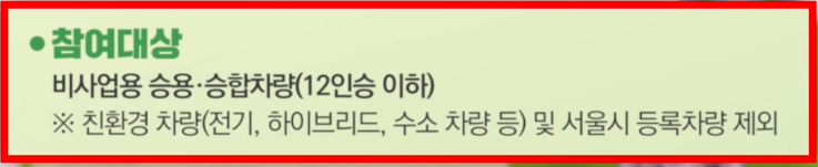 참여대상은 일반 차량과 12인승 이하의 승합차로 친환경 차량과 서울시 등록 차량은 제외합니다