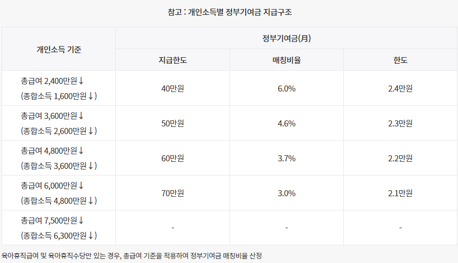 납입한 금액에 비례해 소득구간별 정부기여금을 지원하고, 본인납입금액과 정부기여금에 대한 이자와 이에 대한 비과세 혜택과 저소득층 청년 대상 일정 수준의 우대금리를 제공합니다.