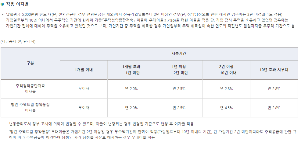 3. 우대이율은 가입기간 2년 이상이면 무주택 기간에 한하여 적용, 가입 2년 미만이더라도 주택공급에 청약하여 당첨된 경우 우대이율이 적용.