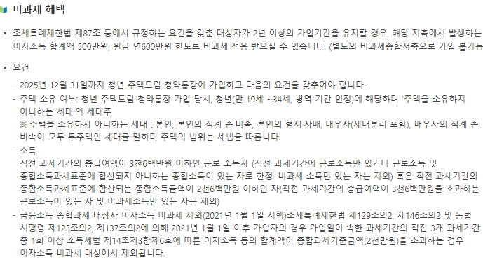 청년 주택드림 청약통장에 가입한 사람 중, 조세특례제한법에 정해진 조건을 충족하는 경우 2년 이상 가입시 이자소득이 500만원, 원금 연600만원까지 비과세 적용 가능. 가입 요건은 주택 미소유자로, 소득은 근로 소득자는 직전 과세기간 총급여액이 3천6백만원 이하, 종합소득이 2천6백만원 이하여야 함. 이자소득 종합과세 대상자는 제외됩니다.